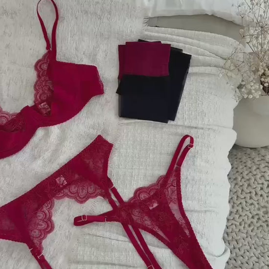 Fiora Secret Dantel Detaylı Jartiyerli İç Giyim Seti, feminen çizgileri ve çarpıcı kırmızı tonu ile güçlü bir siluet sunar.